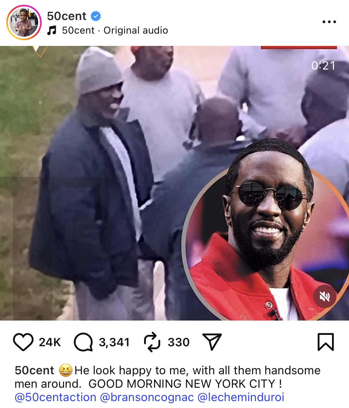 Reveling in his rival’s legal woes, 50 Cent captioned the pics: “He look happy to me, with all them handsome men around. GOOD MORNING NEW YORK CITY!”