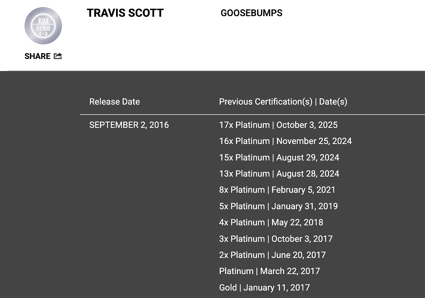“Goosebumps” surpasses the previous record-holder, “God’s Plan” by Drake, which is 16x platinum.
